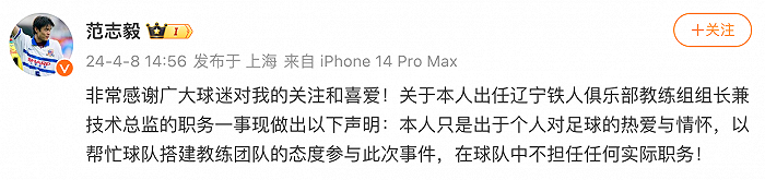 据界面新闻,今日,范志毅就出任辽宁铁人俱乐部教练组组长兼技术总监的职务一事发布声明称,其本人只是出于个人对足球的热爱与情怀,以帮忙球队搭建教练团队的态度参与此次事件,在球队中不担任任何实际职务。