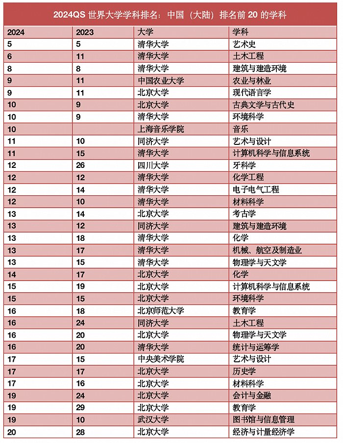清华大学有42个项目入围,较上年增加两个,并且以四个项目跻身全球Top10脱颖而出,这个数量高于其他任何中国大陆高校。这四个项目分别为:艺术史、土木工程、建筑与建造环境、环境科学,分别排名全球第五、第六、第八、第十。中国科学院首次入榜,共有17个学科项目入选。