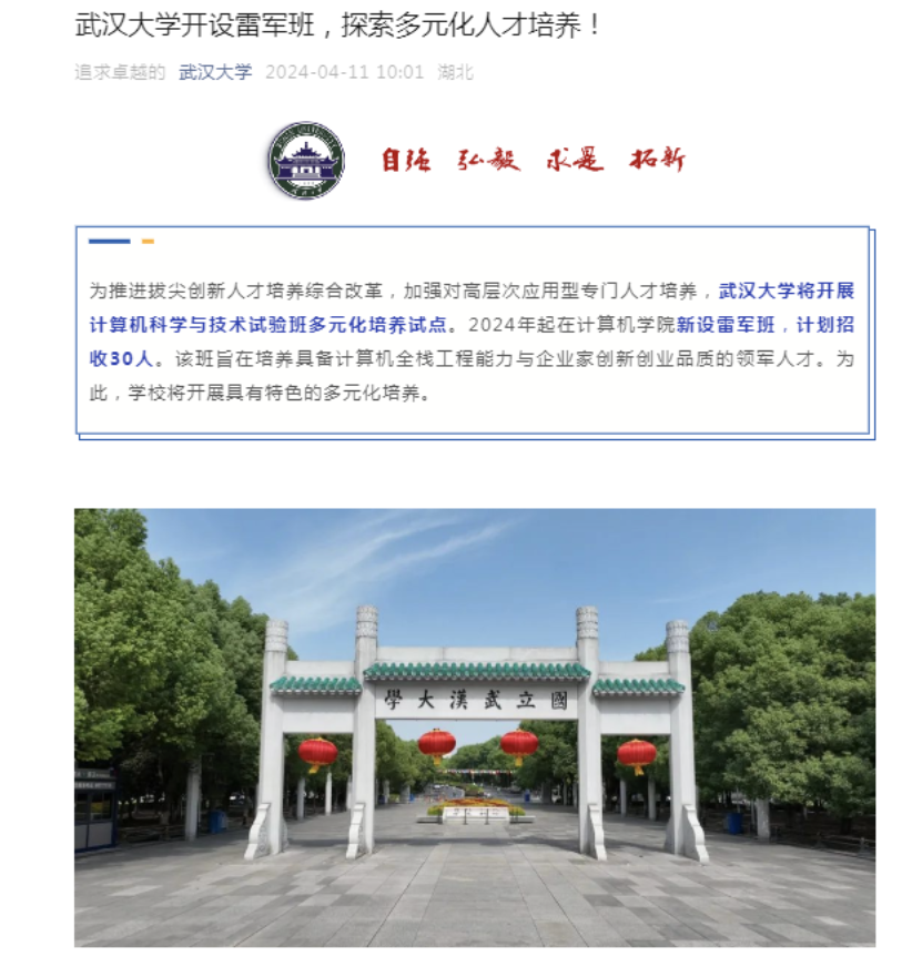 据九派新闻,4月11日,武汉大学宣布今年起在计算机学院新设雷军班,计划招收30人,培养具备计算机全栈工程能力,与企业家创新创业品质的领军人才。内容称,将围绕计算机领域全栈工程能力和创新创业能力培养,与小米等国内头部企业开展深度校企合作,引入头部企业互联网思维方法论和行业前沿软硬件系统设计等优秀课程,针对行业一线技术研发课题开展高水平科研训练和工程实践,培养兼具优异工程研发能力和卓越创新创业能力的领军人才。