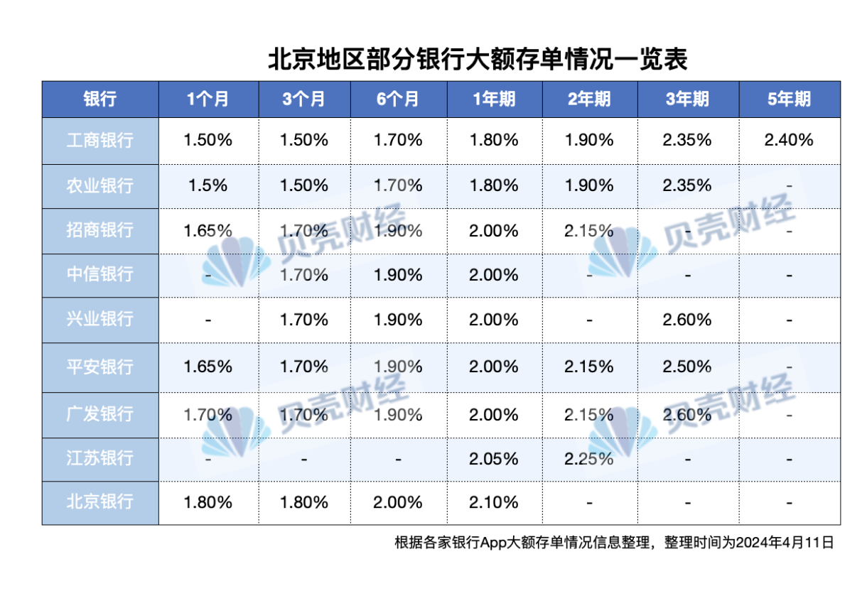 据贝壳财经,今日消息,今日记者通过各家银行App梳理北京地区大额存单情况时发现,目前新发5年期大额存单产品已属罕见。在记者梳理的9家银行中,仅工行仍有新发的5年期大额存单产品,利率为2.40%;招商银行、中信银行、兴业银行、江苏银行、北京银行目前暂无新发放的3年期大额存单额度。