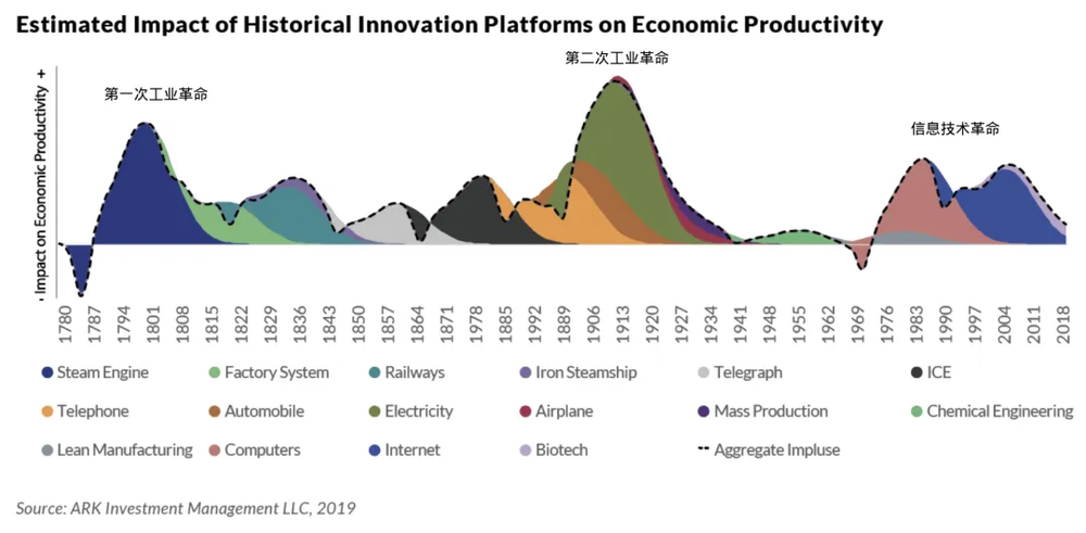 在 ARK 2019 年发布的白皮书中,有一张图表展示了过去两百年技术创新对经济生产力(Economic Productivity)的影响: