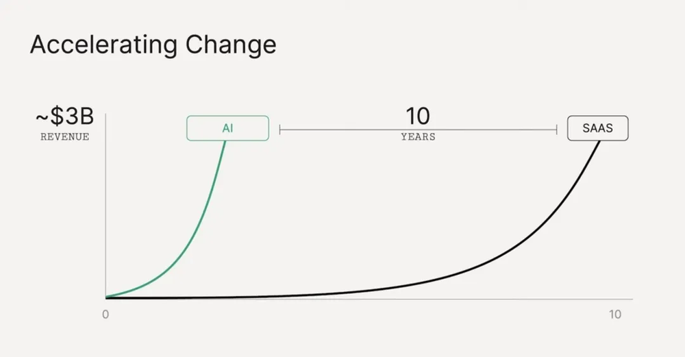 近日红杉在自家的 AI Ascent 2024 活动上提到,生成式 AI 的总收入约为 30 亿美元,这还不包括 F.A.N.G. 四大巨头和云 AI 提供商产生的所有增量收入。以 30 亿美元为基准,SaaS 市场花了近十年的时间才达到这一收入水平,生成式 AI 只用了一年。