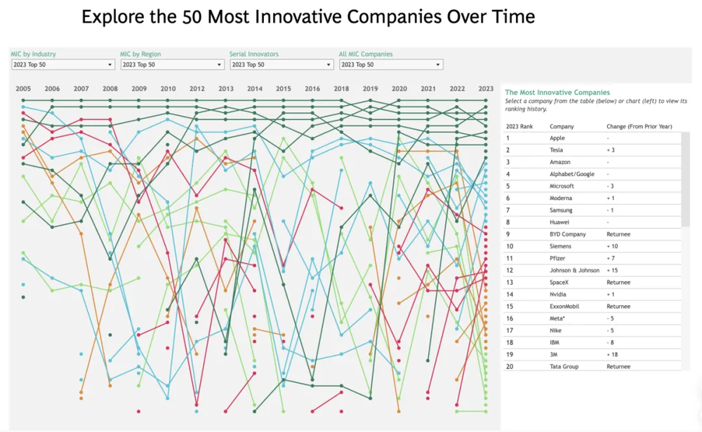 波士顿咨询公司 BCG 每年都会发布 Top 50 创新公司名单,持续了超过二十年。今年,他们将历史榜单的变化做成了一个交互图表。