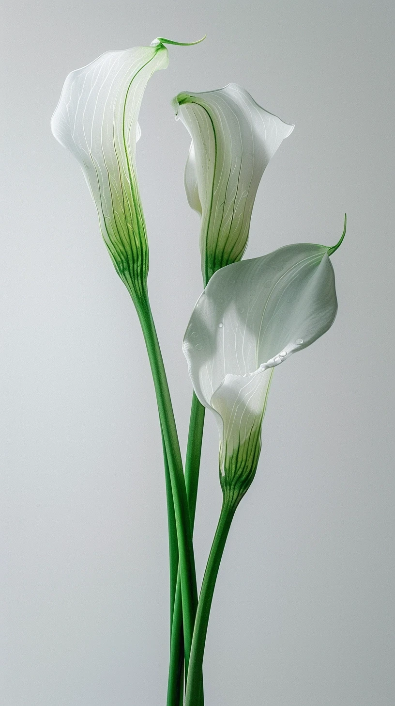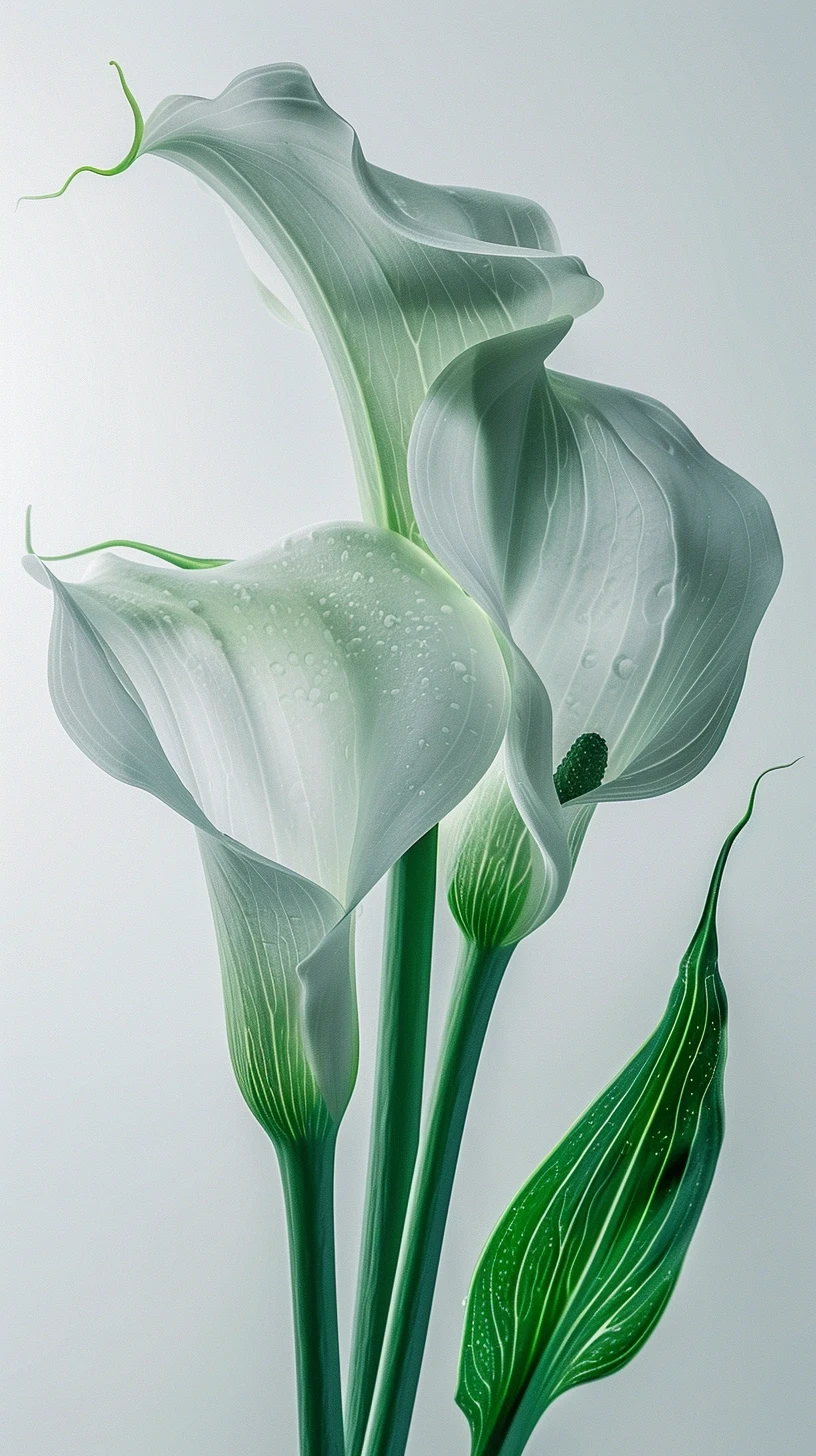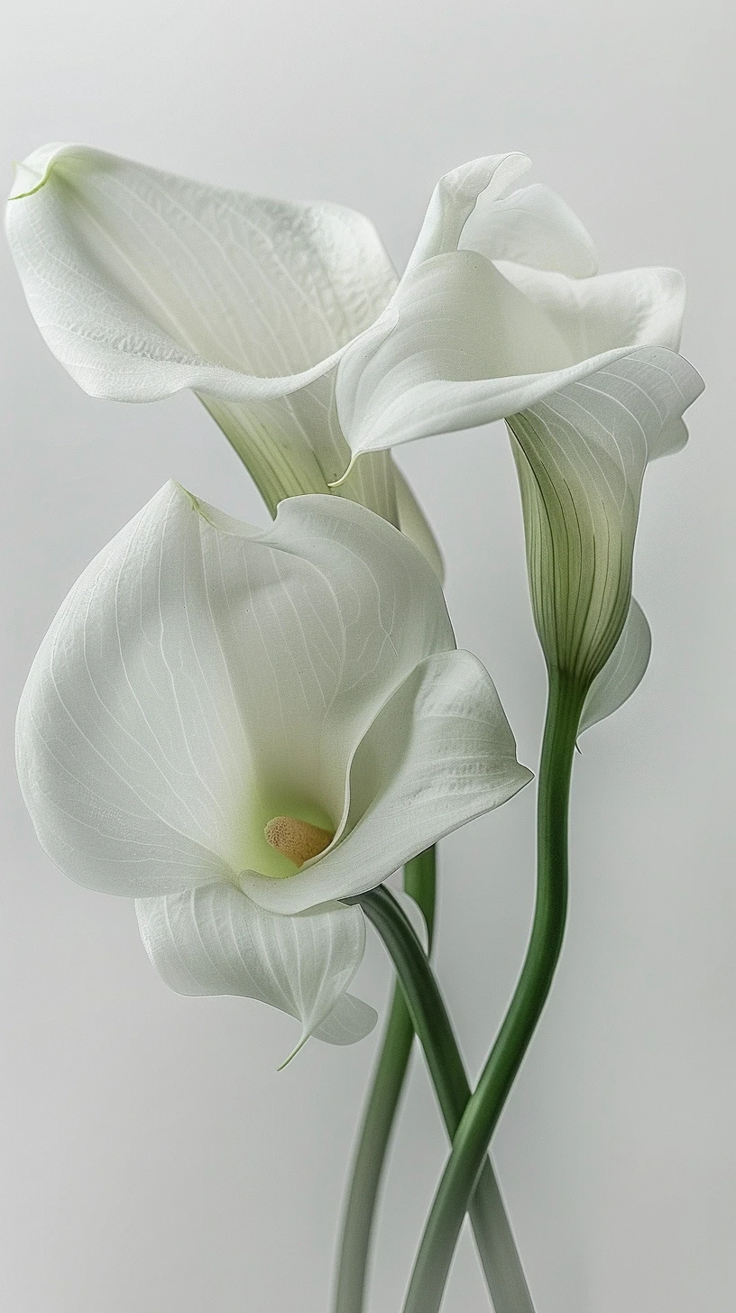 图片呈现了三朵白色的马蹄莲,它们的曲线优雅,姿态高贵。每一朵花都展示着精致的细节,从花瓣上薄如纱的纹理到淡淡的绿色花脉,所有的细节都在柔和的光线下被捕捉得淋漓尽致。花朵的白色与背景的纯净白相互呼应,营造出一种纯洁和平静的感觉。
