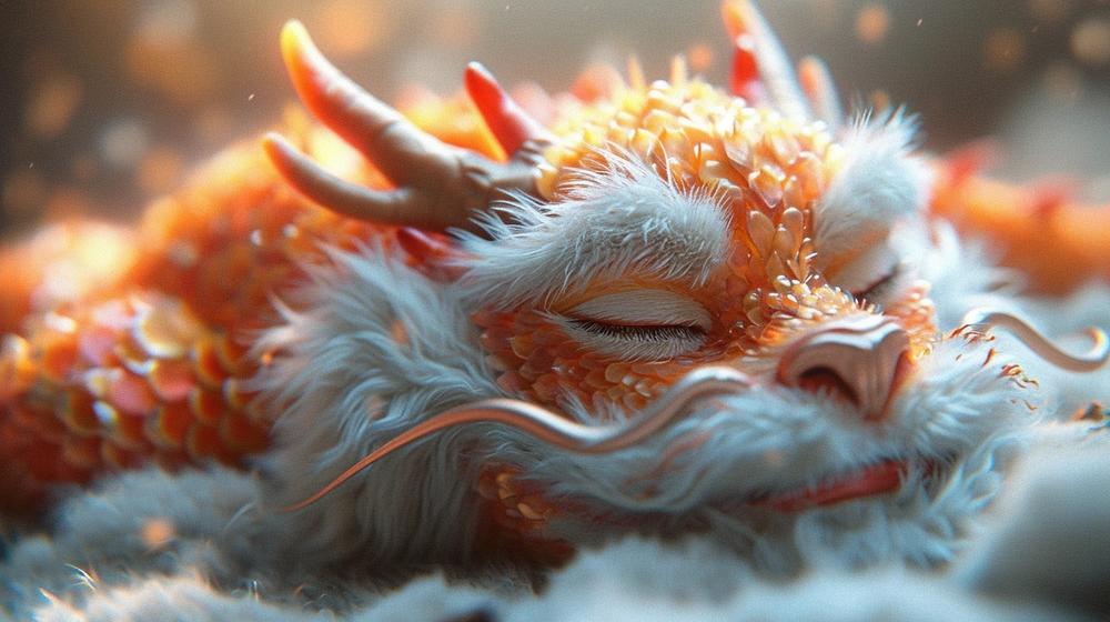 龙的面部特征温和,细节处理精细,从每一根细小的鬃毛到精致的角都表现出宁静的美。图像中的暖色调和模糊的背景增强了一种梦幻般的氛围,让观者感受到和平与宁静。
