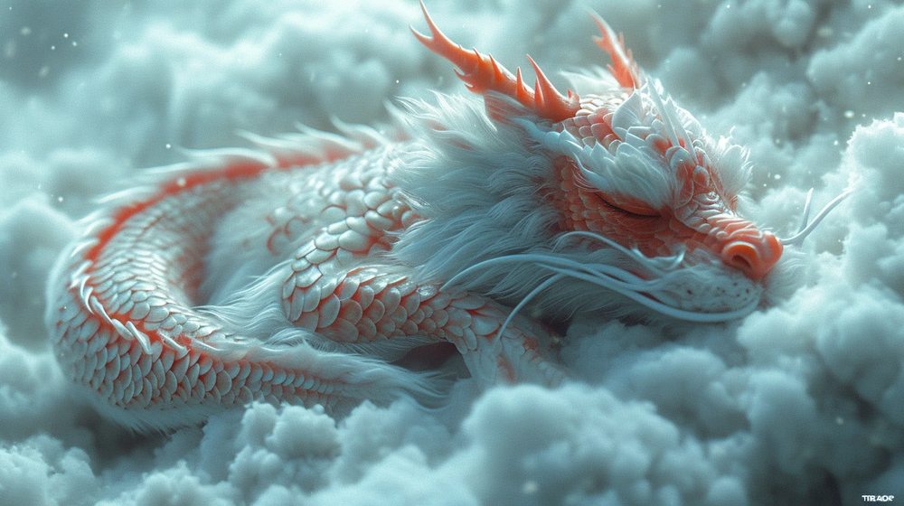 图像展示了一只雪白的龙在冬日的云层中安详地睡眠。它的身体柔软且纤细,覆盖着如雪一般的鳞片,橙色的鬃毛在冰冷的白色中显得格外鲜明。龙的表情宁静,仿佛在梦中遨游。