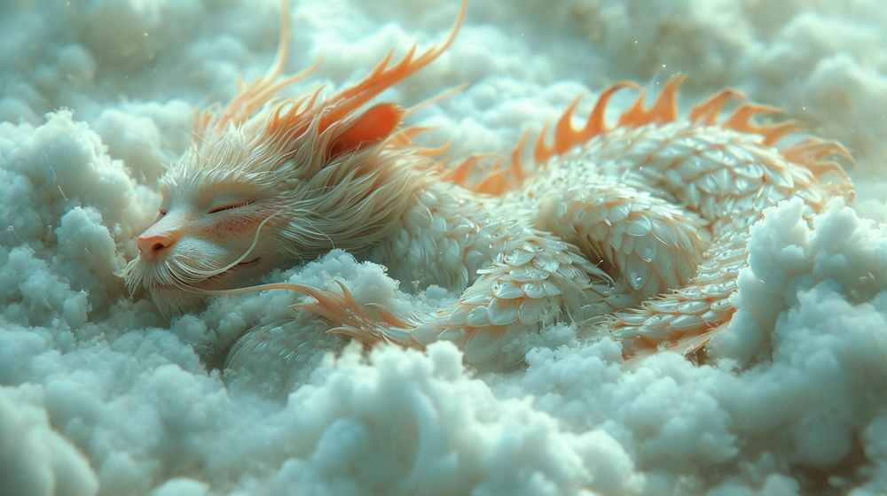 一只巨大的东方龙蜷缩在雪白的云朵中,仿佛在冬日的寒风中找到了一个温暖的梦境。龙的身体呈现出白色和淡红色的色调,与周围的云雾融为一体,创造出一种轻盈而飘渺的视觉效果。