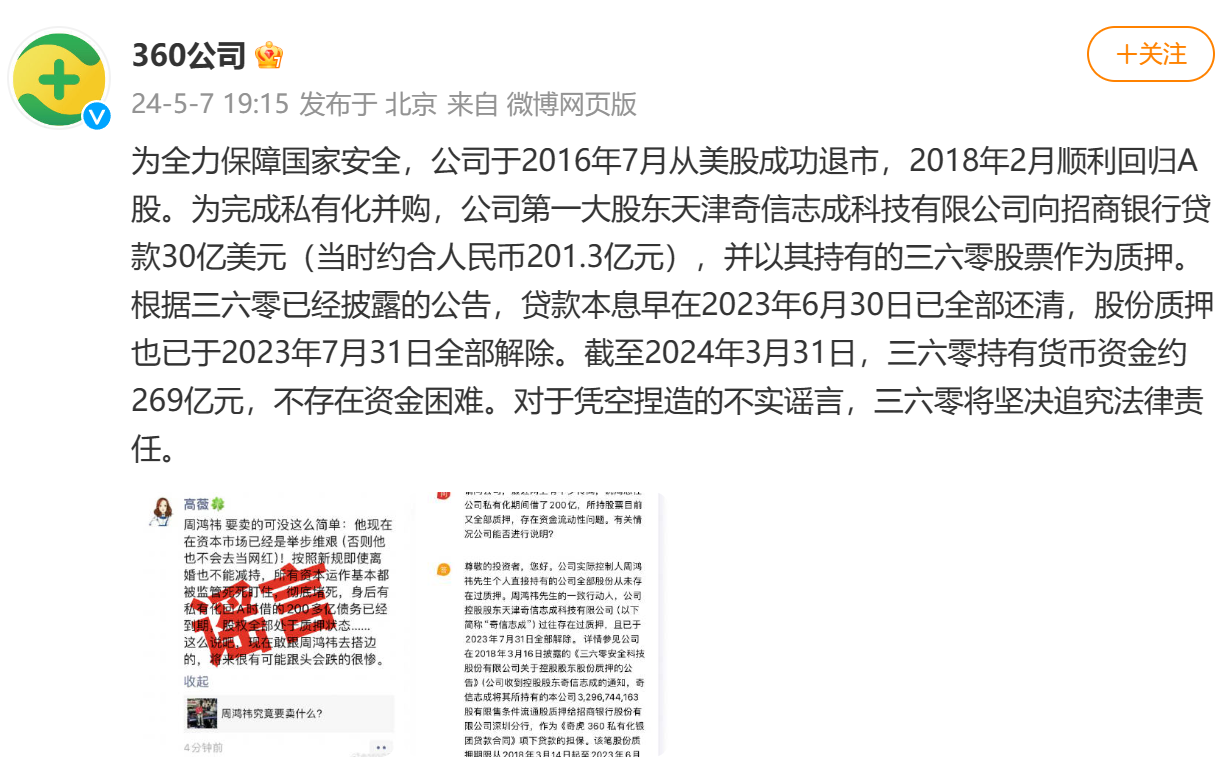 360公司发布微博称,为全力保障国家安全,公司于2016年7月从美股成功退市,2018年2月顺利回归A股。为完成私有化并购,公司第一大股东天津奇信志成科技有限公司向招商银行贷款30亿美元(当时约合人民币201.3亿元),并以其持有的三六零股票作为质押。根据三六零已经披露的公告,贷款本息早在2023年6月30日已全部还清,股份质押也已于2023年7月31日全部解除。截至2024年3月31日,三六零持有货币资金约269亿元,不存在资金困难。对于凭空捏造的不实谣言,三六零将坚决追究法律责任。