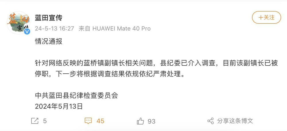 中共蓝田县委宣传部官方微博蓝田宣传发布情况通报。针对网络反映的蓝桥镇副镇长相关问题,县纪委已介入调查,目前该副镇长已被停职,下一步将根据调查结果依规依纪严肃处理。