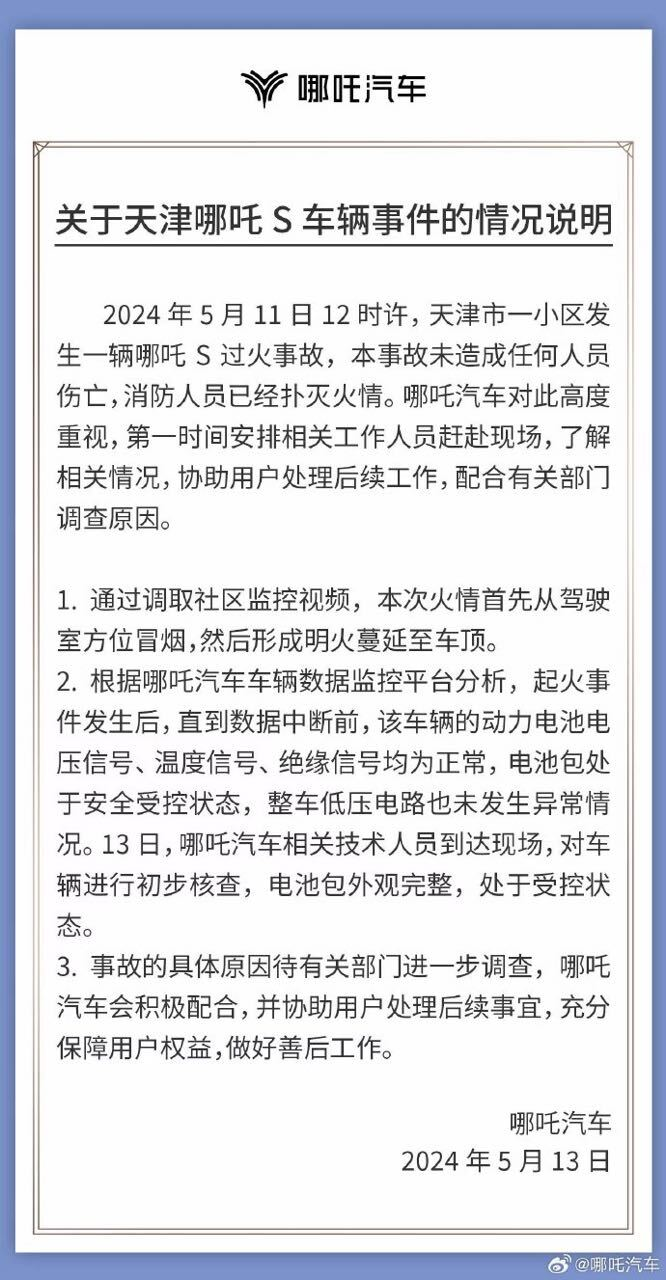 针对天津哪吒S起火事故,哪吒汽车今日发布声明回应称,通过调取社区监控视频,本次火情首先从驾驶室方位冒烟然后形成明火蔓延至车顶。