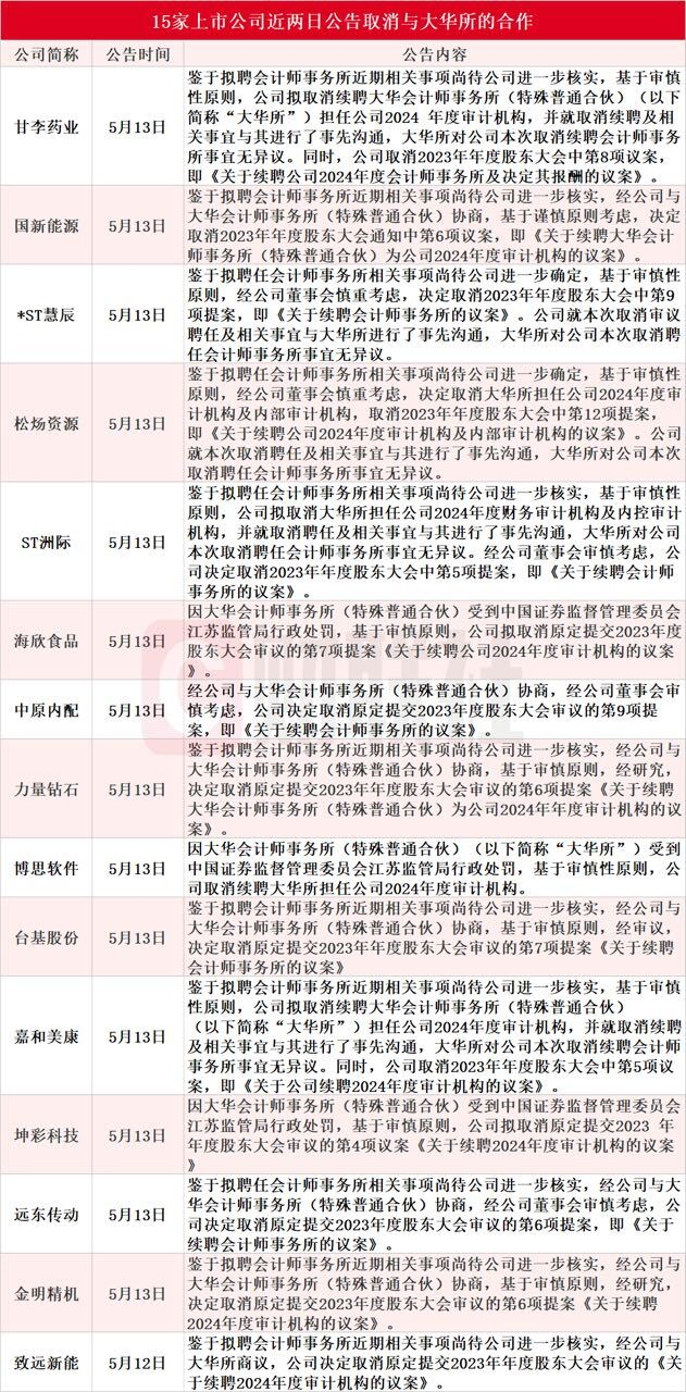 据财联社不完全统计,截至发稿,包括甘李药业、国新能源、*ST慧辰、松炀资源、ST洲际、海欣食品、中原内配、力量钻石、博思软件、台基股份、嘉和美康、坤彩科技、远东传动、金明精机和致远新能在内的15家A股上市公司近两日公告取消与大华所的合作。其中,致远新能率先与大华所终止合作。此外,对于取消合作的原因,博思软件、坤彩科技和海欣食品的表述明确,称因大华所近日受到江苏证监局行政处罚;甘李药业、国新能源、*ST慧辰、松炀资源、ST洲际、力量钻石、台基股份、嘉和美康、远东传动、金明精机和致远新能公告称鉴于大华所近期相关事项尚待公司进一步核实。小财注:因涉金通灵连续6年造假,大华所遭暂停业务6个月。