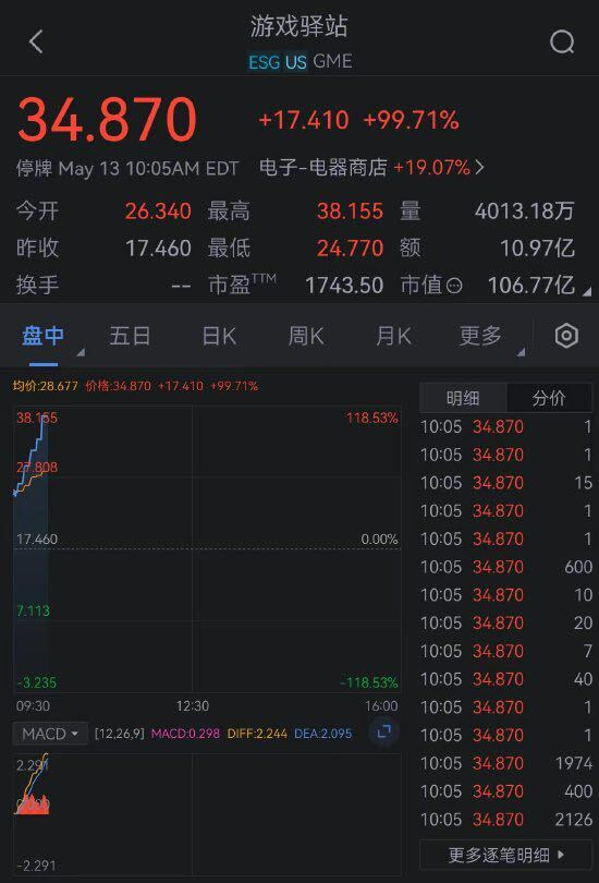 据新浪科技,游戏驿站(31.98, 14.52, 83.16%)盘中第六次触发熔断,涨幅收窄至99.71%。消息面上,此前曾幕后推动散户大战华尔街的“头号牛散”时隔三年回归社媒平台“X”。