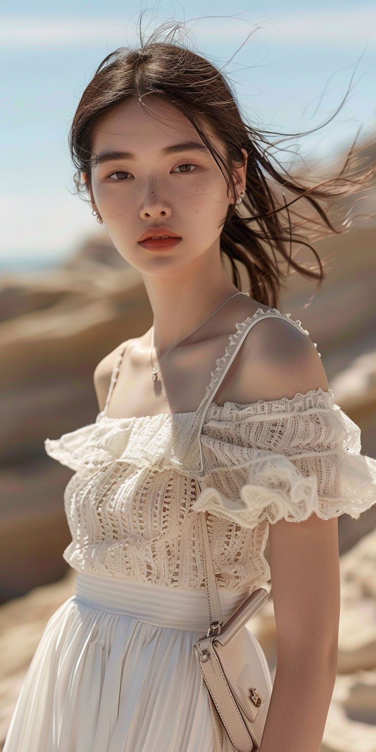 一位穿着白色蕾丝连衣裙的年轻女子,背景是广阔的沙漠景观。她的头发被微风轻轻吹动,表情平静而充满思考。