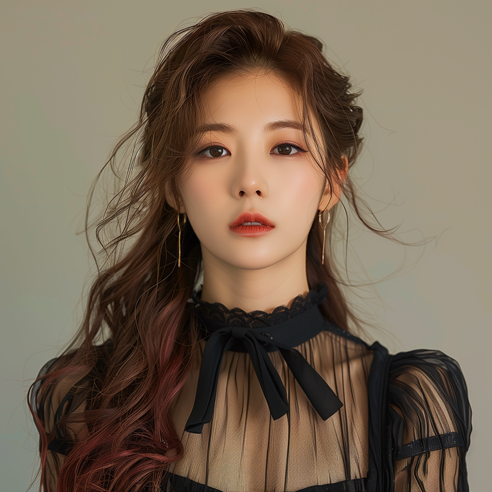 Prompt:Portrait of a beautiful 20-year-old woman who embodies the elegance and charm of a Korean idol. Her look captures the vibrant energy and fashion-forward sensibility of K-pop culture.