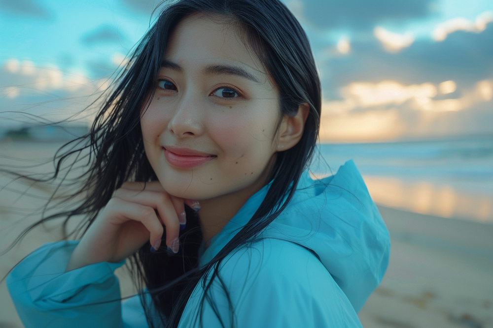 Prompt:A photo of an Asian woman with long straight black hair, smiling and gently touching her face in front of the camera on a beach in a blue windbreaker. captured in the style of Canon EOS R5 F2 ISO300.