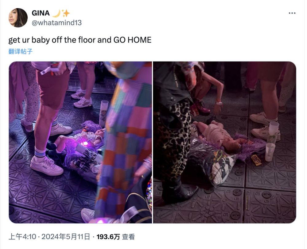 有人在泰勒·斯威夫特的演唱会捕捉到这样一幕:有粉丝在演唱会上,把自己的孩子就那样放在地板上,婴儿带着降噪耳机,旁边是许多大人的脚。要知道,一场泰勒的演唱会能挤进去多少人,万一发生踩踏事故,婴儿估计就危了。
