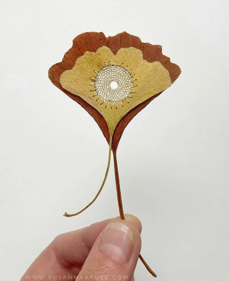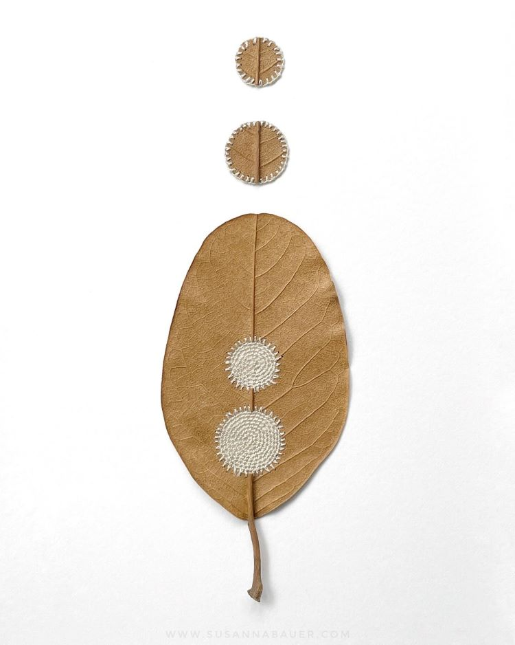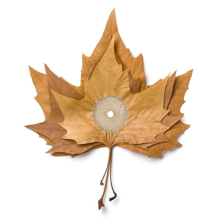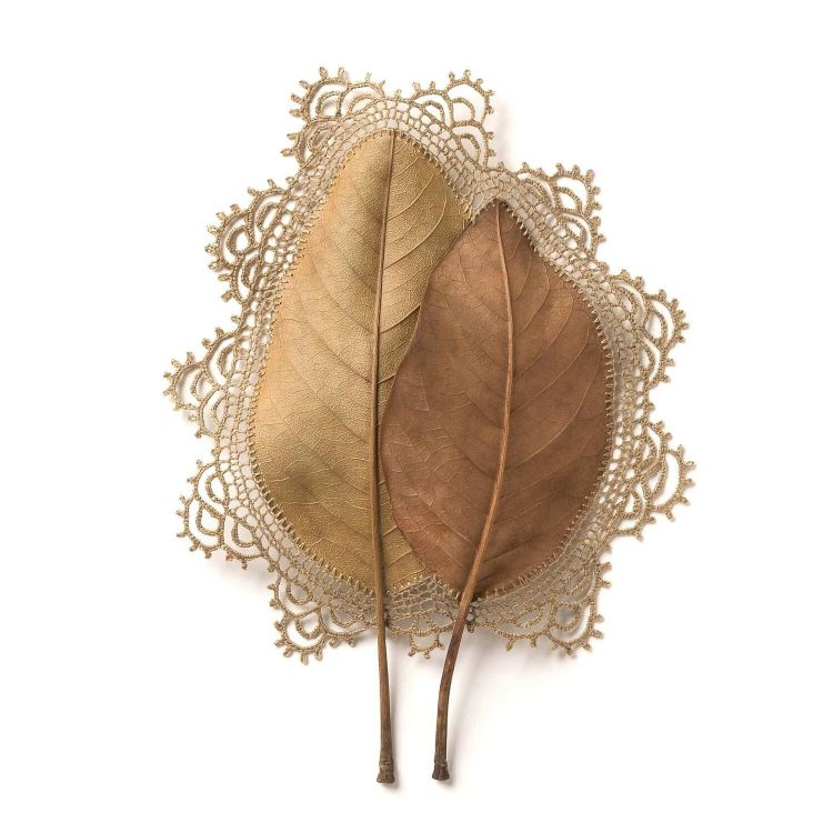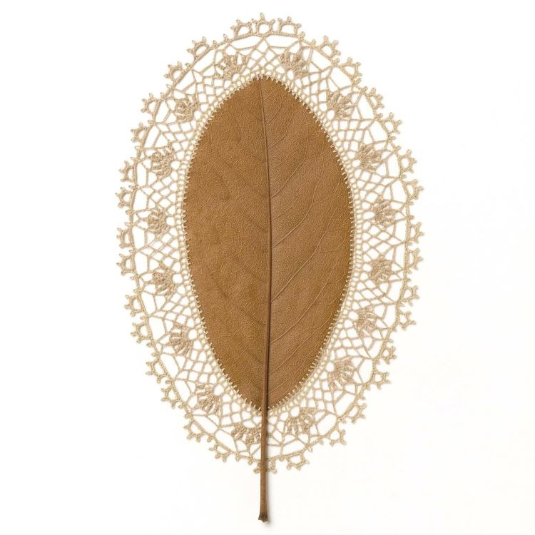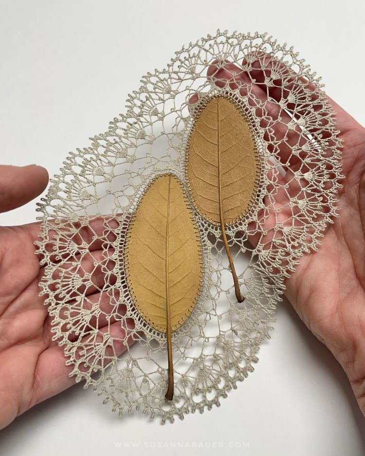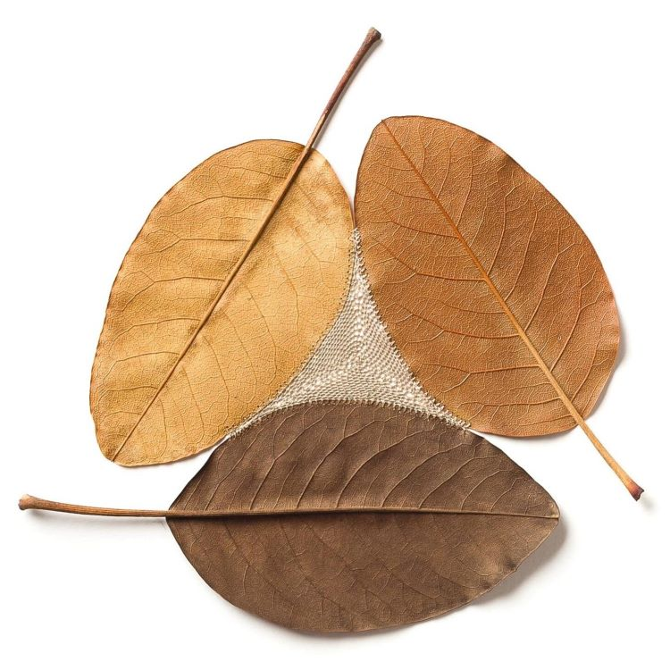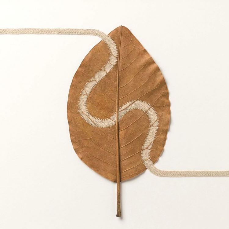 她擅长以自然的树叶做为基地,编织美丽的花边与其结合,针线巧妙地穿过脆弱的树叶,天衣无缝地与它融为一体。