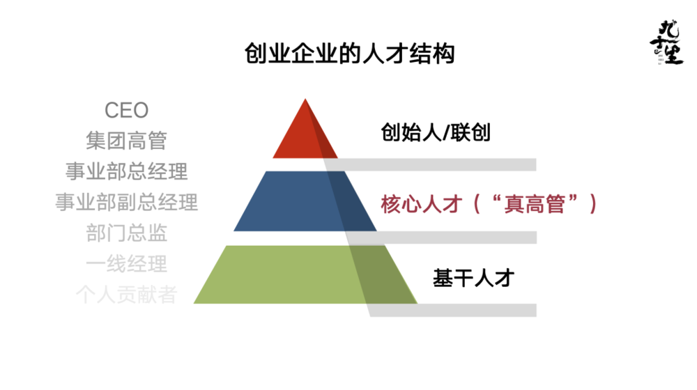 但创业公司需不需要真高管?我认为是需要的,只是在创业公司里面的高管真的没那么“高”,也没有那么贵,但是他的位置很重要,承载着公司这台机器正常往下运转的那个功能,缺了他不行。我把创业公司的高管称为核心人才(Core Talen)。