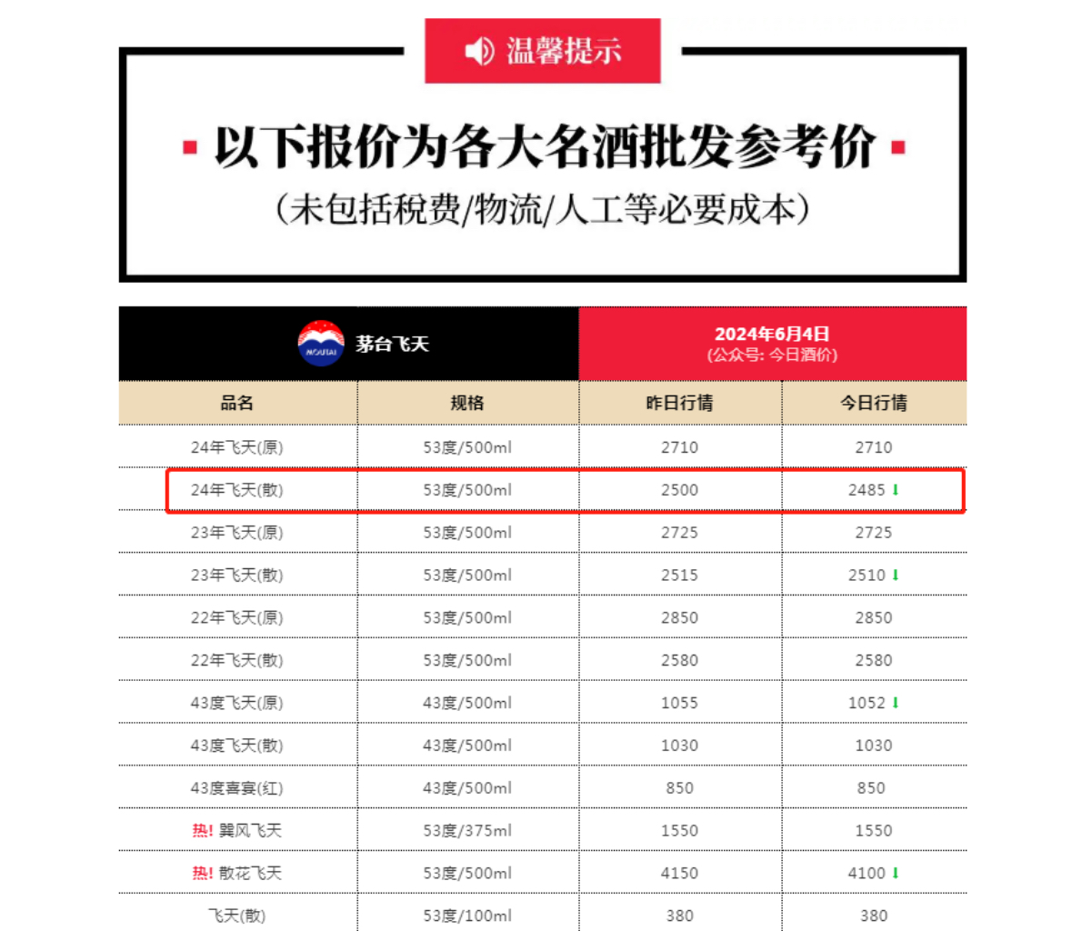 据上海证券报,6月4日,据今日酒价数据,2024年茅台飞天(散)53度/500ml批发参考价跌破2500元大关,报2485元,较上一日下跌15元。