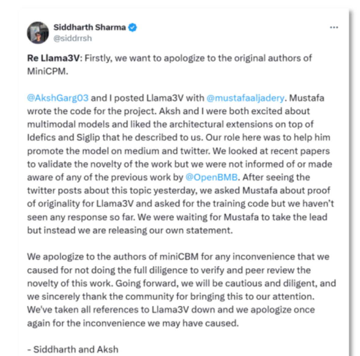 据财联社,斯坦福一AI团队发布了一个名为Llama3-V的多模态大模型,宣称只需500美元就可训练出一个性能可与GPT4-V媲美的模型。但随后,该团队发布的模型被指抄袭,其与国内清华系大模型相似度极高。面壁智能CEO李大海和联合创始人刘知远先后发文回应,表示这是一种受到国际团队认可的方式,但希望大家共建开放、合作、有信任的社区环境。目前,该团队已公开道歉,并删除了相关库和官宣推文。