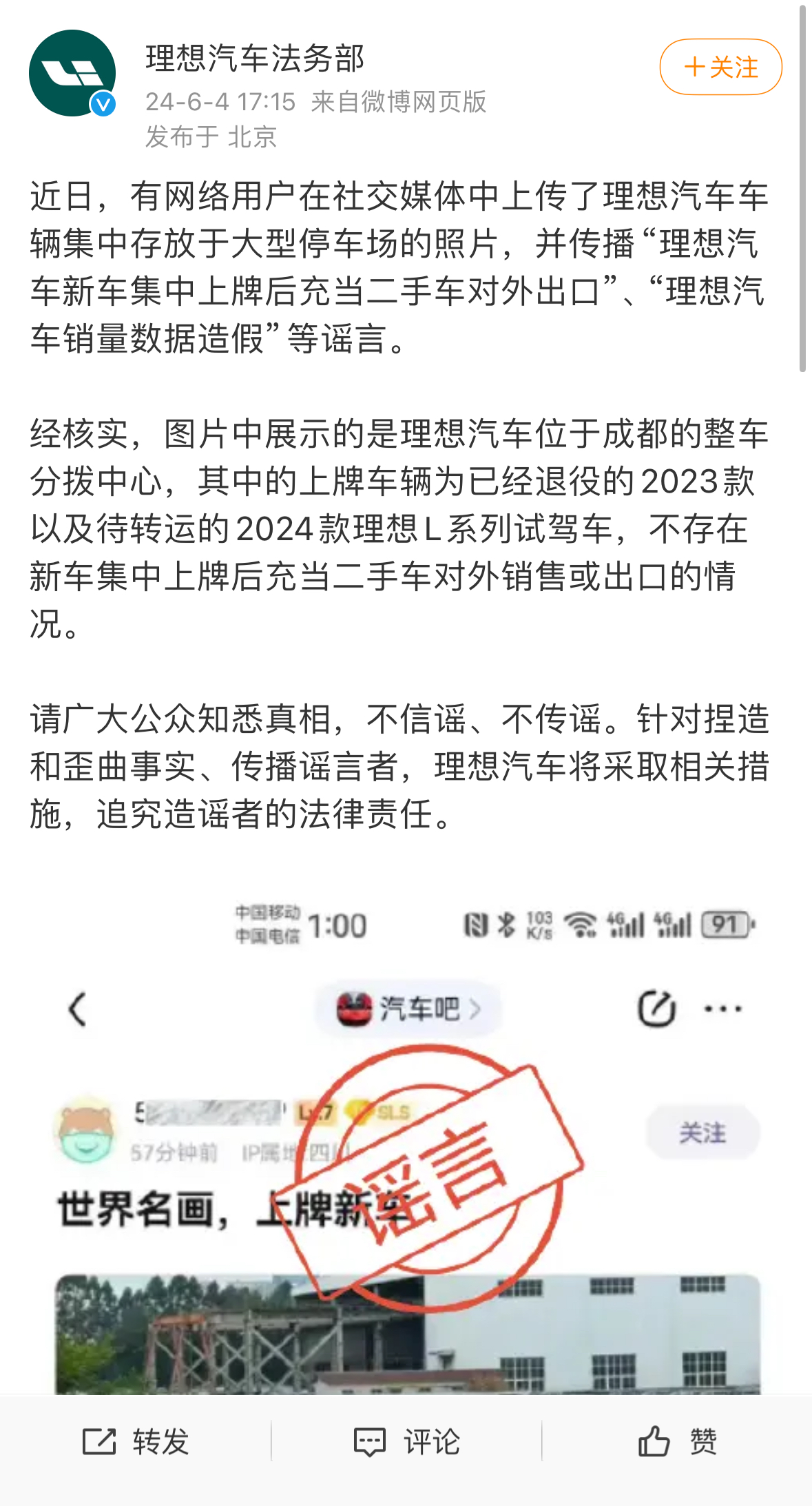 今日,理想汽车法务部发布声明称,近日有网络用户在社交媒体中上传了理想汽车车辆集中存放于大型停车场的照片,并传播“理想汽车新车集中上牌后充当二手车对外出口”、“理想汽车销量数据造假”等谣言。经核实,图片中展示的是理想汽车位于成都的整车分拨中心,其中的上牌车辆为已经退役的2023款以及待转运的2024款理想L系列试驾车,不存在新车集中上牌后充当二手车对外销售或出口的情况。针对捏造和歪曲事实、传播谣言者,理想汽车将采取相关措施,追究造谣者的法律责任。