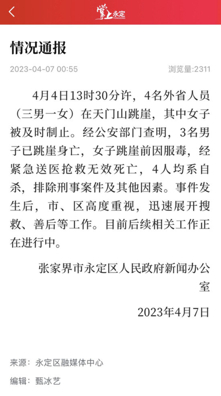 据掌上永定客户端消息,4月7日,张家界市永定区人民政府新闻办公室通报:4月4日13时30分许,4名外省人员(三男一女)在天门山跳崖,其中女子被及时制止。经公安部门查明,3名男子已跳崖身亡,女子跳崖前因服毒,经紧急送医抢救无效死亡,4人均系自杀,排除刑事案件及其他因素。事件发生后,市、区高度重视,迅速展开搜救、善后等工作。目前后续相关工作正在进行中。