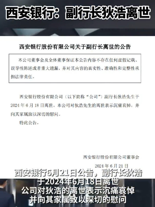 据财联社,西安银行6月21日公告,副行长狄浩于2024年6月18日离世。公司对狄浩的离世表示沉痛哀悼,并向其家属致以深切的慰问。