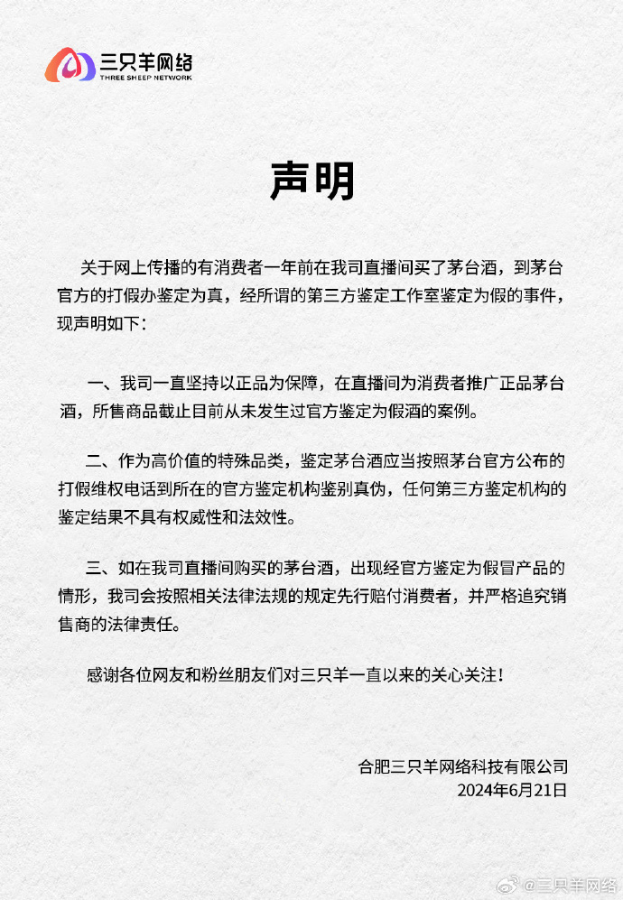 据每日经济新闻,6月21日,三只羊网络通过微博“疯狂小杨弟-三只羊”发文称,关于网上传播的有消费者一年前在公司直播间买了茅台酒,到茅台官方的打假办鉴定为真,经所谓的第三方鉴定工作室鉴定为假的事件,作出声明。