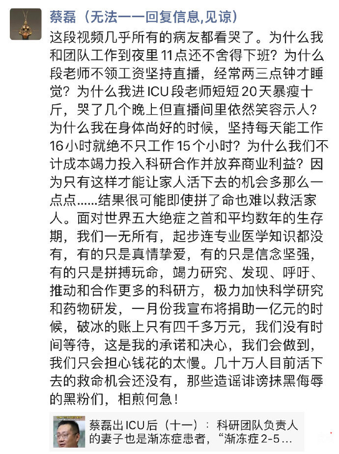 据读特新闻,6月22日,渐冻症抗争者蔡磊在社交媒体发声,谈及团队竭尽全力推进渐冻症攻克事业的原因。蔡磊表示他和团队工作到夜里11点不舍得下班、不计成本竭力投入科研合作并放弃商业利益、妻子段睿不领工资坚持直播等努力,都是为了让病友活下去的机会多那么一点点,但结果很可能即使拼了命也难以救活家人。他同时透露,在他住进ICU期间,妻子短短20天暴瘦十斤,哭了几个晚上但直播间里依然笑容示人。蔡磊表示,面对世界五大绝症之首和平均数年的生存期,他和团队一无所有,有的只是真情挚爱、信念坚强、拼搏玩命,竭力研究、发现、呼吁、推动和合作更多的科研方,极力加快科学研究和药物研发。