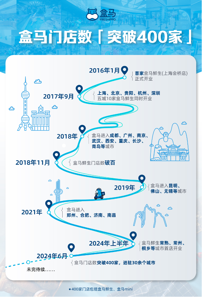 从2016年开始到今天的八年间,盒马从扎根上海到走向全国,如今已在30余个城市开出400家门店(盒马鲜生、盒马mini)。