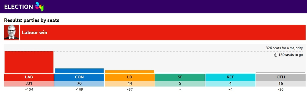 据央视新闻,根据英国大选计票结果,当地时间5日凌晨,工党在议会下院选举中赢得超过半数席位,获得选举胜利。工党党首基尔·斯塔默将出任新一任英国首相并组建政府。