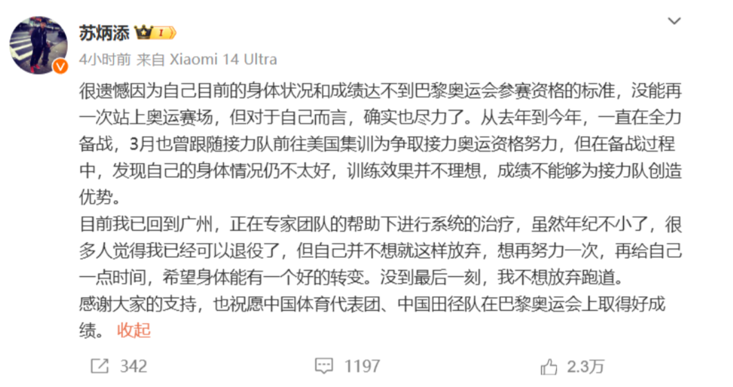 7月5日,苏炳添发文回应:很遗憾因为自己目前的身体状况和成绩达不到巴黎奥运会参赛资格的标准,没能再一次站上奥运赛场,但对于自己而言,确实也尽力了。从去年到今年,一直在全力备战,3月也曾跟随接力队前往美国集训为争取接力奥运资格努力,但在备战过程中,发现自己的身体情况仍不太好,训练效果并不理想,成绩不能够为接力队创造优势。目前我已回到广州,正在专家团队的帮助下进行系统的治疗,虽然年纪不小了,很多人觉得我已经可以退役了,但自己并不想就这样放弃,想再努力一次,再给自己一点时间,希望身体能有一个好的转变。没到最后一刻,我不想放弃跑道。感谢大家的支持,也祝愿中国体育代表团、中国田径队在巴黎奥运会上取得好成绩。