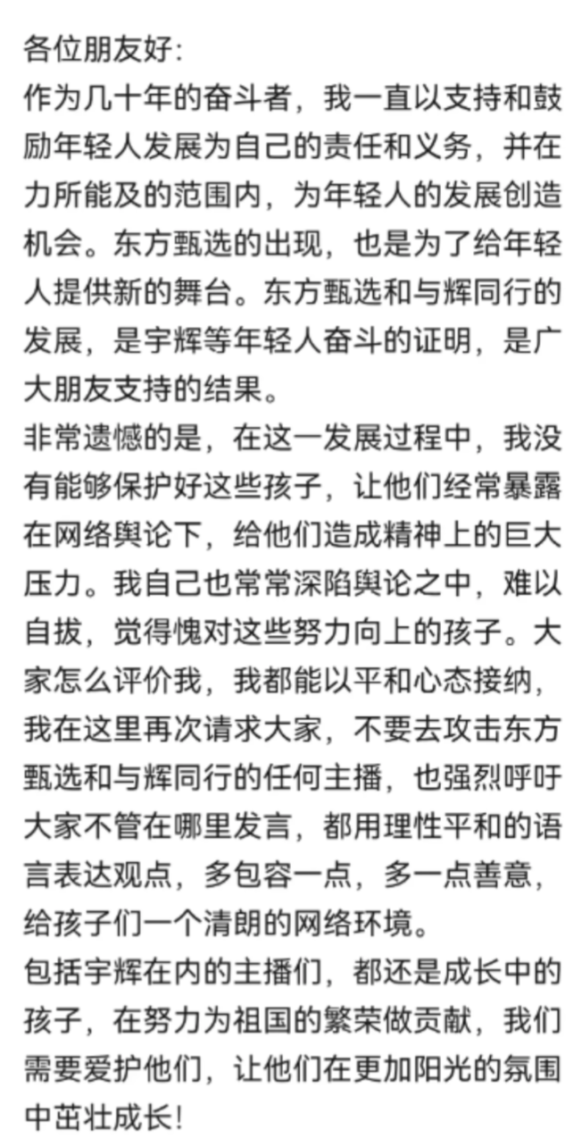 7月5日,对于最近连续不断的风波,@俞敏洪 在社交平台发文,呼吁不要攻击东方甄选和与辉同行的主播。他表示,东方甄选和与辉同行在发展过程中,自己没有能够保护好这些孩子,让他们经常暴露在网络舆论下,给他们造成精神上的巨大压力。