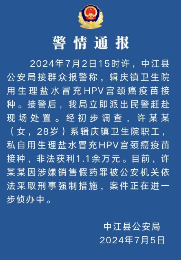 四川中江县公安局7月5日通报,7月2日15时许,中江县公安局接群众报警称,辑庆镇卫生院用生理盐水冒充HPV宫颈癌疫苗接种。接警后,警方立即派出民警赶赴现场处置。经初步调查,许某某(女,28岁)系辑庆镇卫生院职工,私自用生理盐水冒充HPV宫颈癌疫苗接种,非法获利1.1余万元。目前,许某某因涉嫌销售假药罪被公安机关依法采取刑事强制措施,案件正在进一步侦办中。