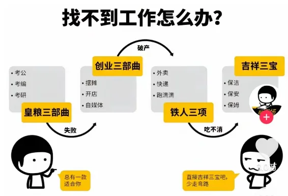 而大家的回复则褒贬不一,既有网友鼓励他重新振作,也有人笑他太过天真。现在社会有个说法就是:毕业后不知道找什么工作就去考公考研考编,考不成了就要经历35岁危机,出来自立门户;创业失败的话只能从事“铁人三项”,通过外卖、快递、跑滴滴这种体力活来维持收入;如果体力跟不上了,就只能干“吉祥三宝”,干点保洁、保安、保姆的工作,最后熬到退休。