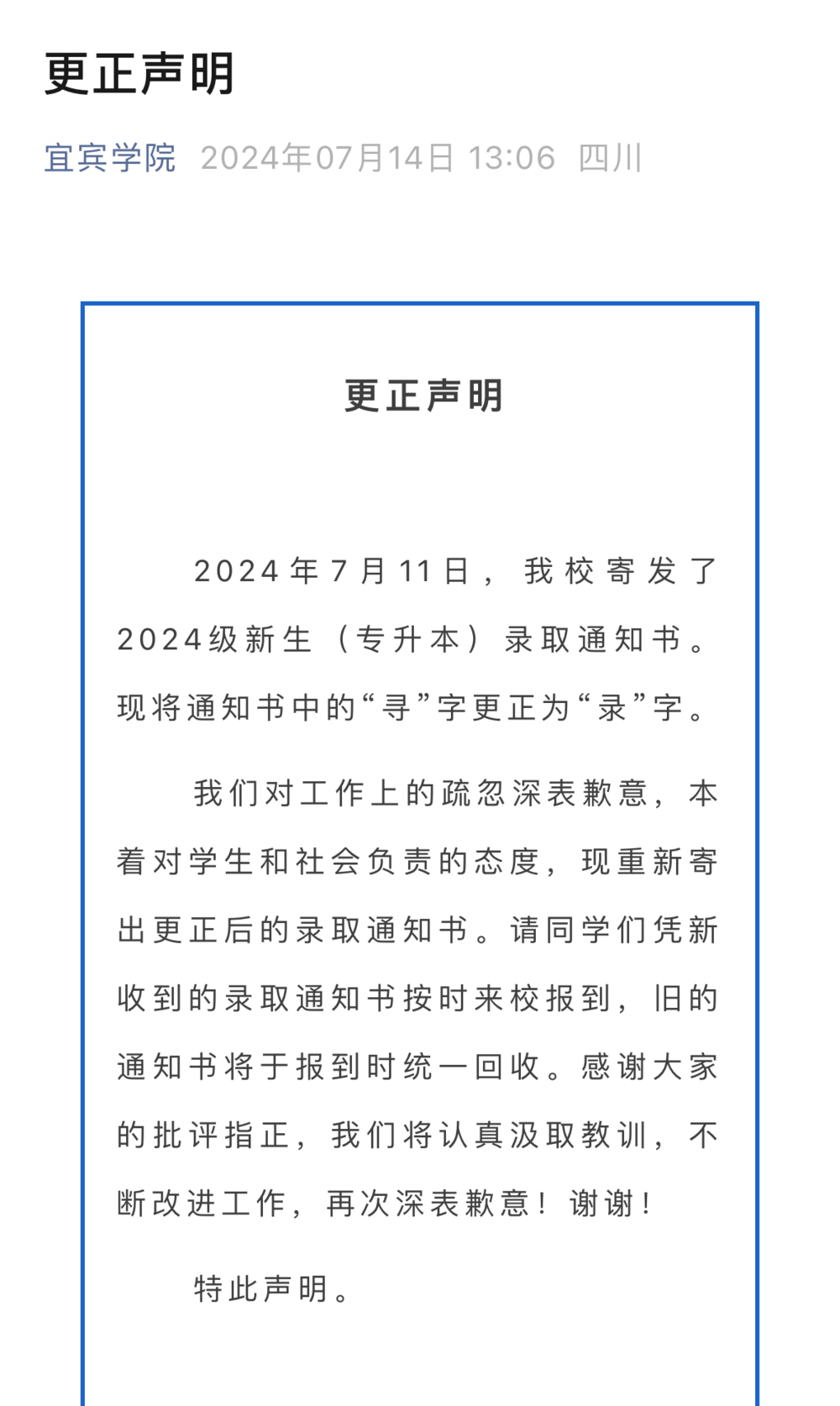 据澎湃新闻,7月14日,宜宾学院就录取通知书中的“录”写成“寻”致歉:已重新寄出更正后的录取通知书,报到时旧通知书统一收回,将汲取教训改进工作。