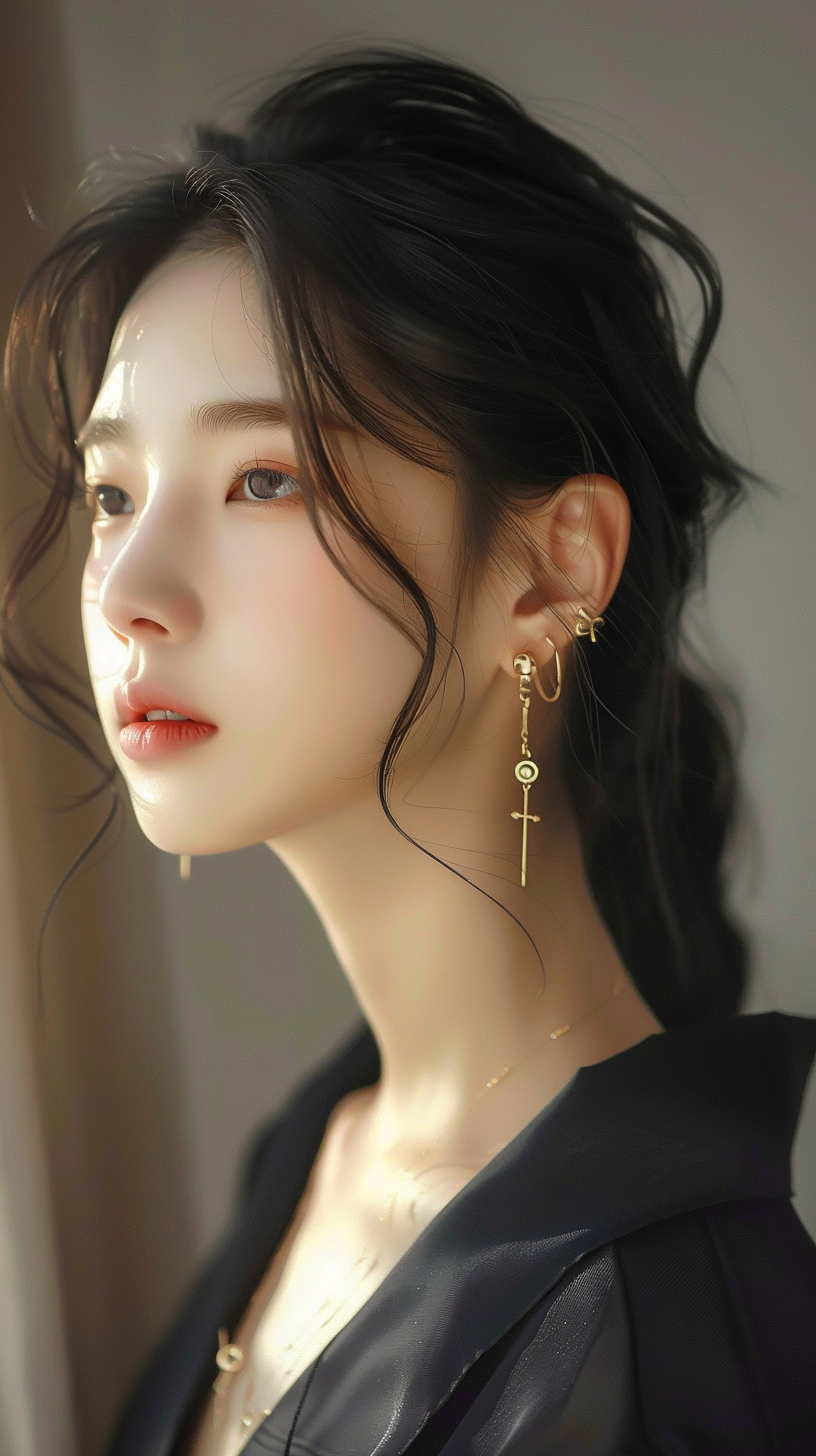 一位年轻女性的侧面,她的头发被轻柔地向后梳理,露出耳朵上佩戴的金色耳环,设计独特,其中一个耳环有着十字架的装饰。她的眼神温柔而深邃,似乎在凝视远方