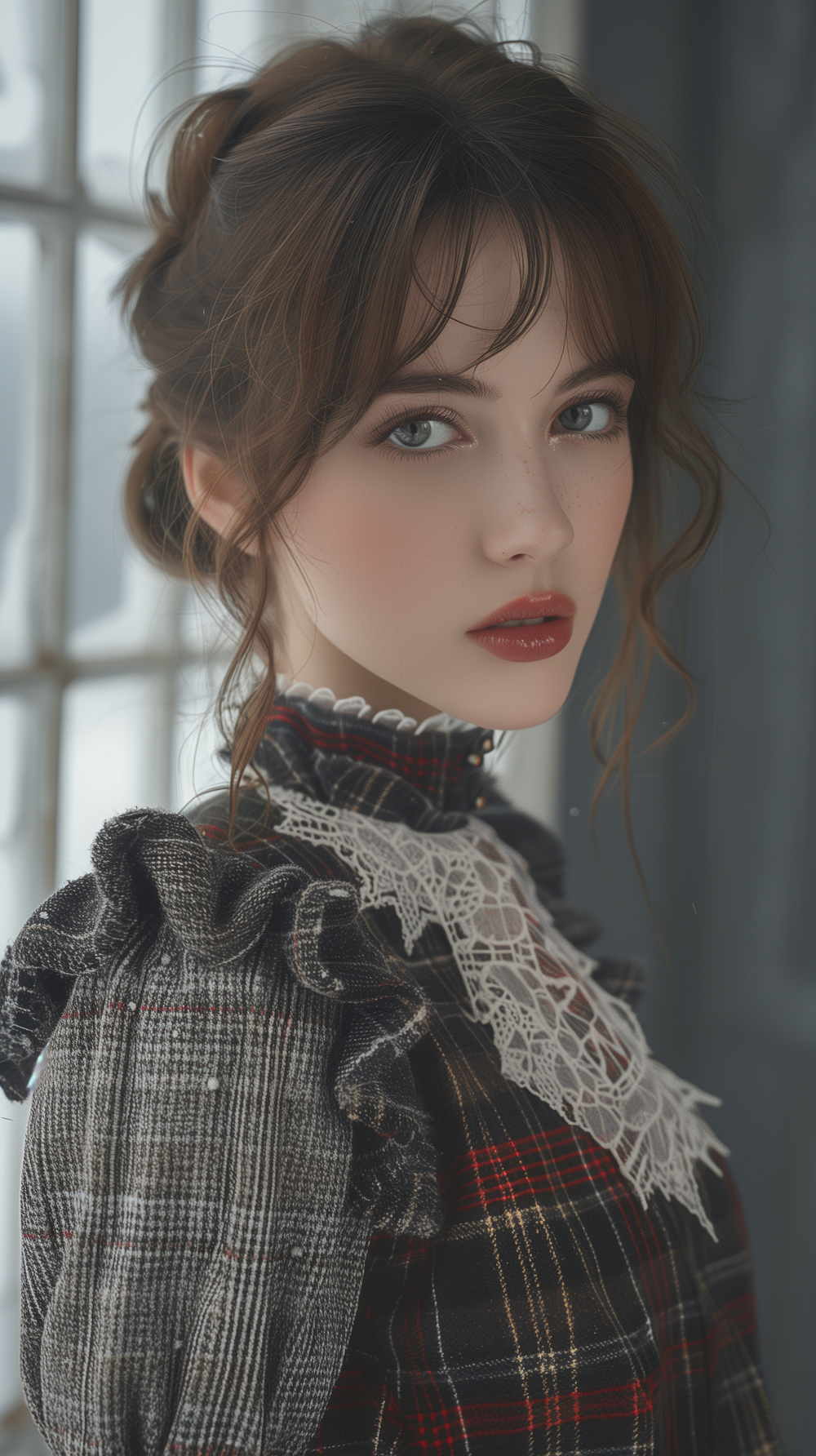 一位年轻女性,穿着具有复古维多利亚风格的服装,包括一件格子和蕾丝结合的衬衫。她的发型是松散而优雅的低烧,额前有几缕自然垂落的刘海,增添了一种随性而又精致的感觉。她的眼神深邃,嘴唇略显红润,脸上洋溢着青春的光泽。
