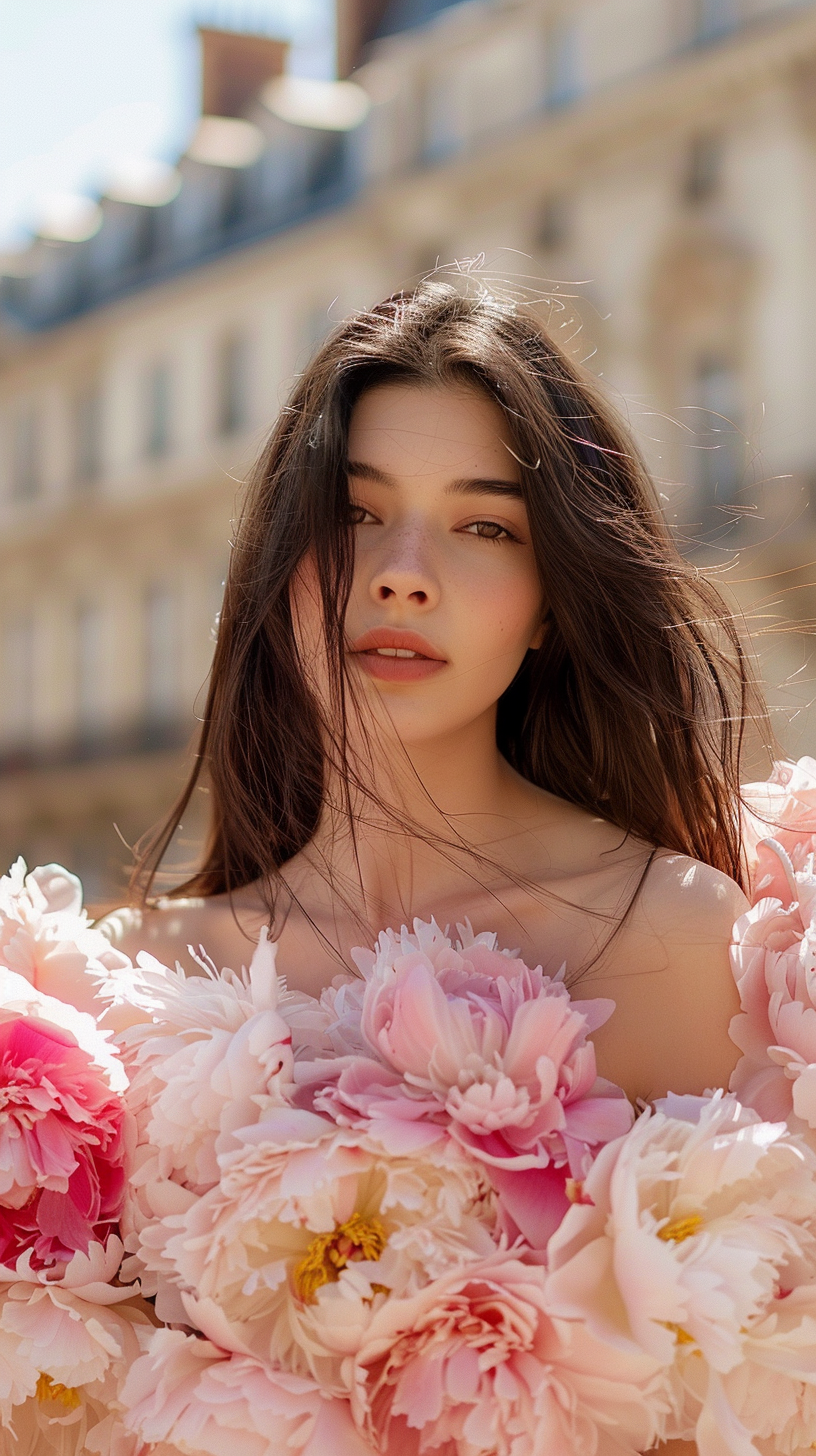 Prompt:Woman with long dark hair, two blonde strands in front. Woman wearing a dress of fresh peony flowers. Woman standing in the street, with the Palace of Versailles in the background. She is cheerful and confident. Picture from a photo shoot.