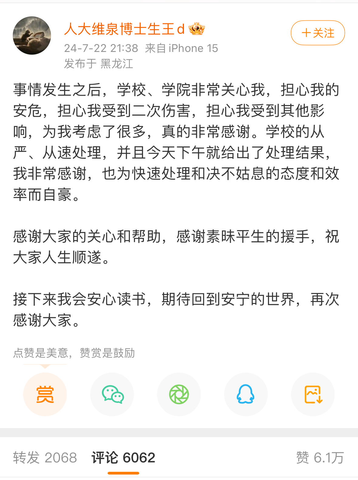 事情发生之后,学校、学院非常关心我,担心我的安危,担心我受到二次伤害,担心我受到其他影响,为我考虑了很多,真的非常感谢。学校的从严、从速处理,并且今天下午就给出了处理结果,我非常感谢,也为快速处理和决不姑息的态度和效率而自豪。