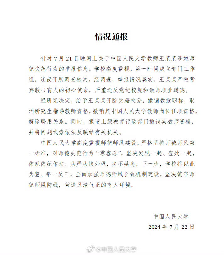 针对 7月21日晚网上关于中国人民大学教师王某某涉嫌师德失范行为的举报信息,@中国人民大学 通报:举报情况属实。