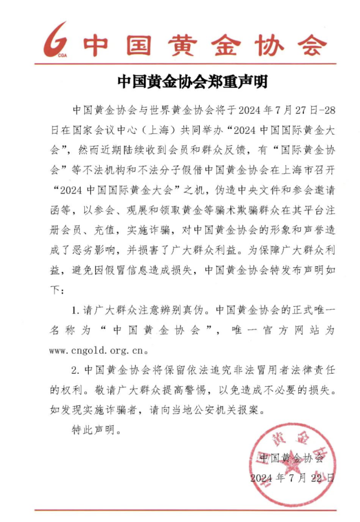 据界面新闻,7月22日,中国黄金协会发布声明:中国黄金协会与世界黄金协会将于2024年7月27日-28日在国家会议中心(上海)共同举办“2024中国国际黄金大会”,然而近期陆续收到会员和群众反馈,有“国际黄金协会”等不法机构和不法分子假借中国黄金协会在上海市召开“2024 中国国际黄金大会”之机,伪造中央文件和参会邀请函等,以参会、观展和领取黄金等骗术欺骗群众在其平台注册会员、充值,实施诈骗,对中国黄金协会的形象和声誉造成了恶劣影响,并损害了广大群众利益。中国黄金协会将保留依法追究非法冒用者法律责任的权利。