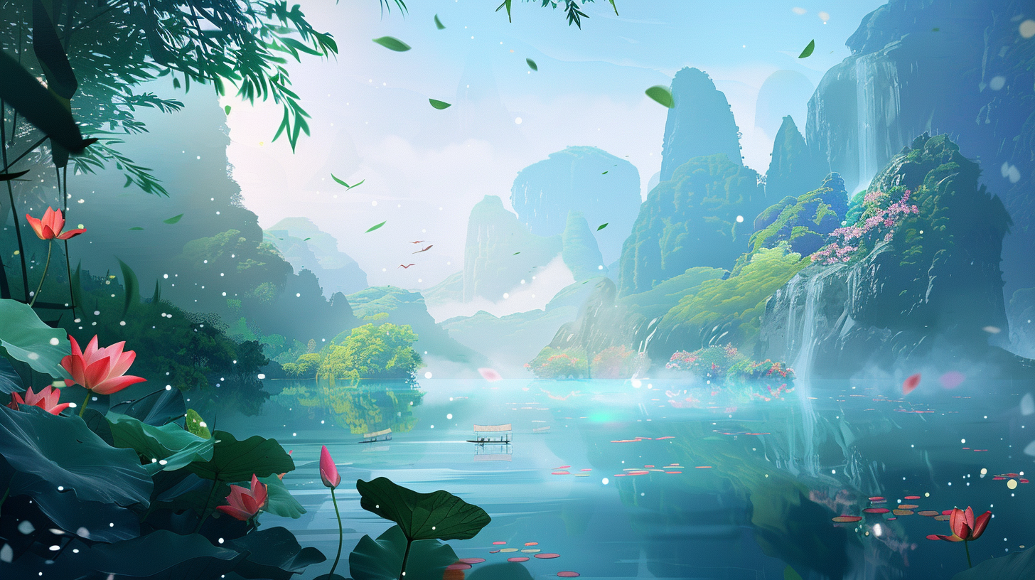 一个宁静的山水景观,其中包括静静流淌的湖水、翠绿的山峦和飞瀑。湖面上漂浮着粉红色的荷花,周围环绕着郁郁葱葱的植被和花卉。画面中的光影效果和粒子效果增添了一种神秘和梦幻的感觉,使整个场景看起来像是出自一个平静而美丽的童话世界。