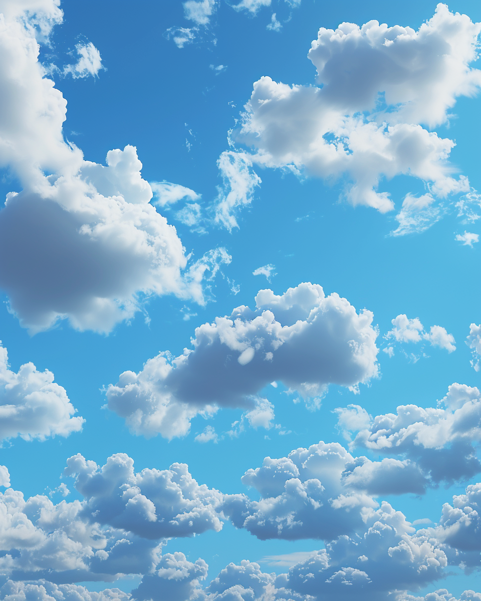 一片明媚的蓝天,散布着厚重而蓬松的白云。这些云朵形状各异,从棉花糖般的轻盈到厚实的层状堆积,呈现出动态丰富的视觉层次。光线透过云层,与云朵的边缘形成明亮的轮廓,增添了一种生动的立体感。