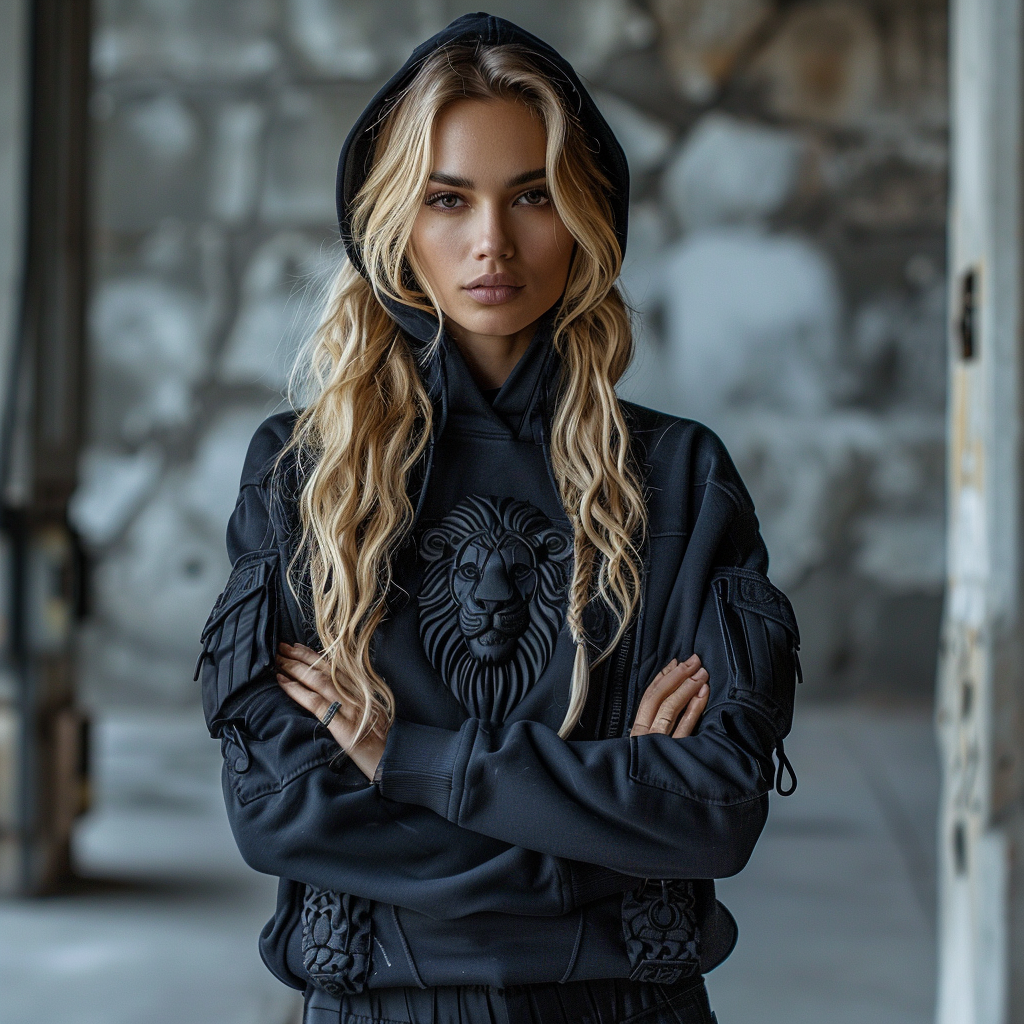 这张图片展示了一位金发女性,穿着带有狮子图案的黑色连帽衫,双臂交叉,表情冷酷且坚定。背景是一个略显破旧的工业风场景,给人一种坚韧和自信的感觉