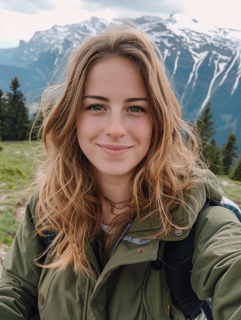 Prompt:a selfie shot of a millenial woman in switzerland, smiling