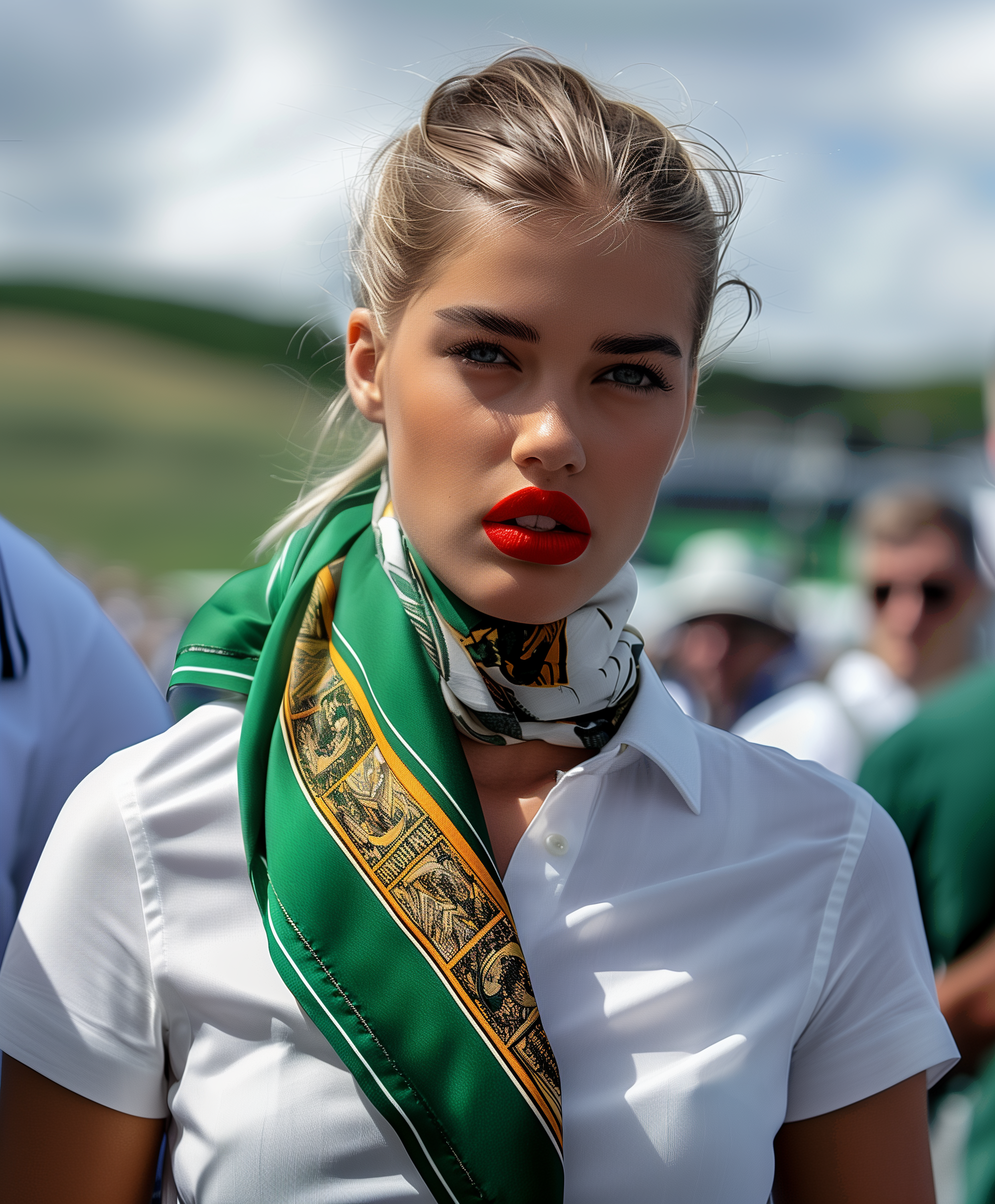 一位金发女性,身穿白色衬衫,搭配一条绿色图案的丝巾。她的嘴唇涂着鲜艳的红色口红,表情坚定而自信。背景是户外的一片人群和绿色的自然景观,整个画面充满了时尚和优雅的气息