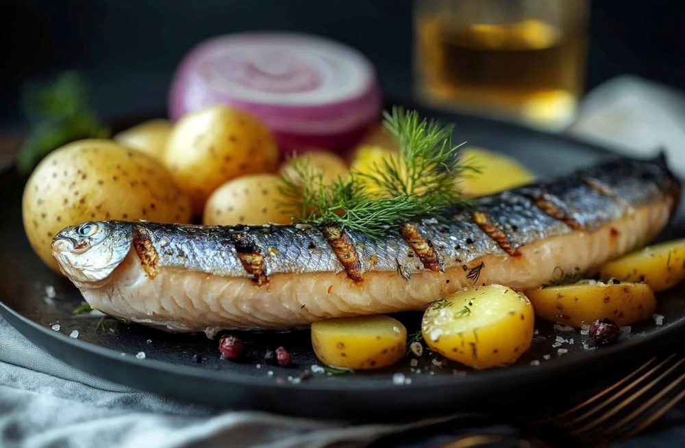 Prompt:A glass of vodka, some pickled herring and potatoes on the table. On one side is an onion ring with dill leaves, all arranged in such a way that it creates a beautiful composition. The background color should be dark blue or black to highlight the colors of the big fish and herbs. In front there is a fork with a white linen napkin.