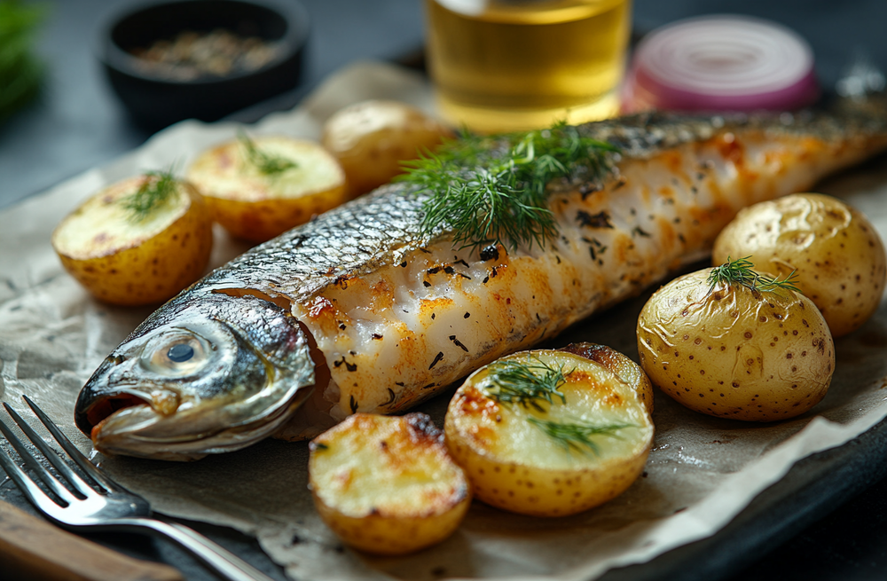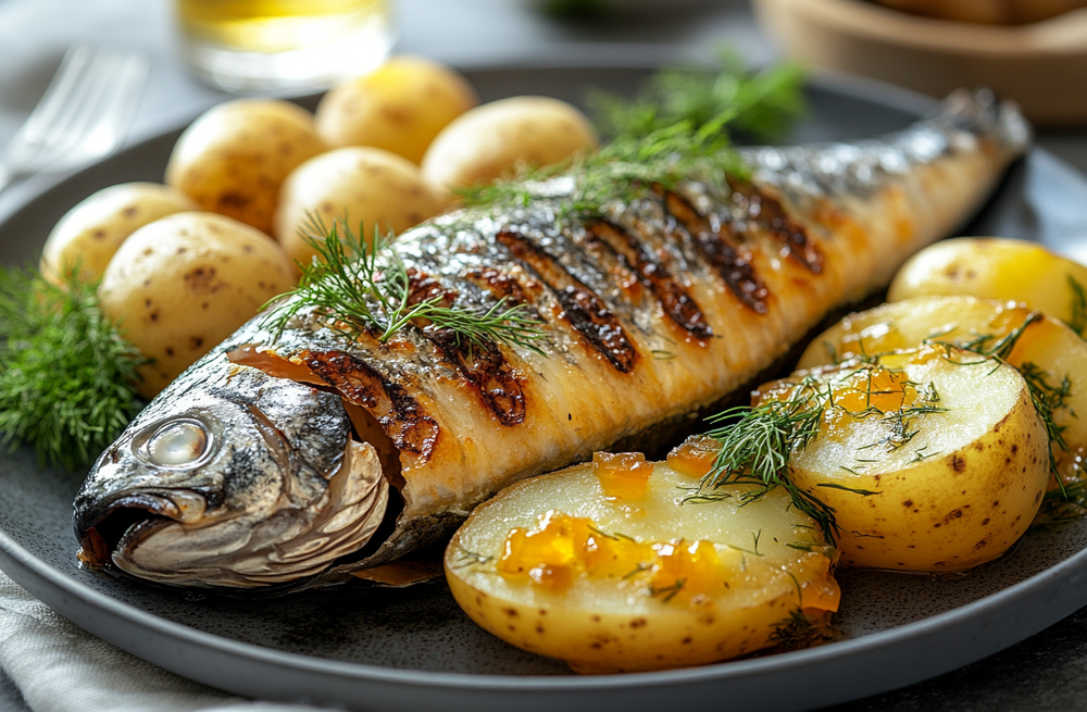 一道简单但极具吸引力的烤鲈鱼,鱼身上有着均匀的烤痕,鱼旁是烤得柔软的土豆片,点缀着香草,搭配上一些胡椒和盐调味。