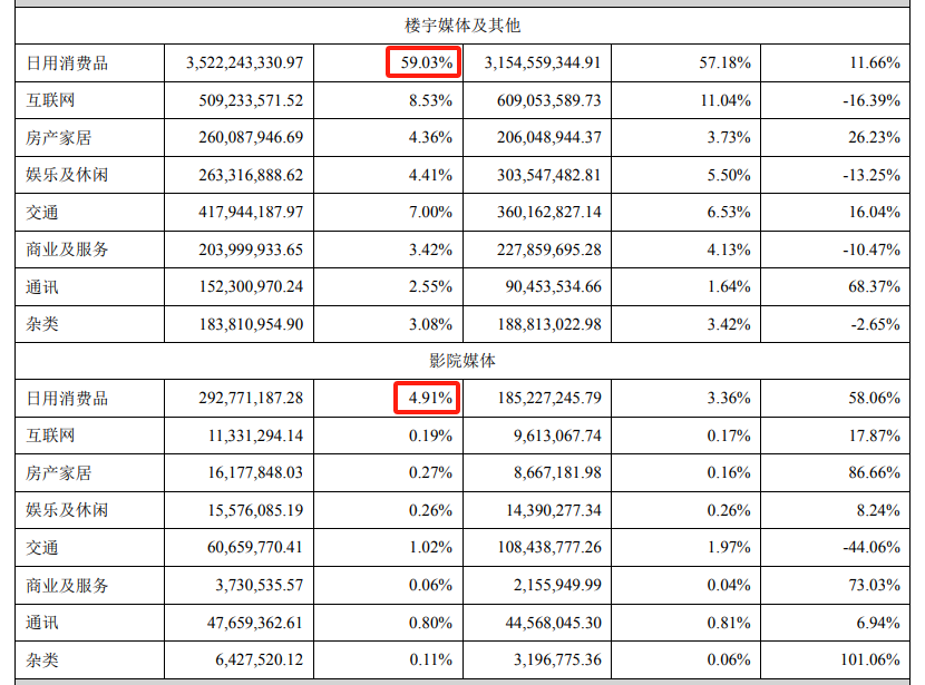不管是电梯广告还是电影院广告,“日用消费品”客户都是绝对主力,合计为分众带来了63.9%的收入。而且,增长速度可圈可点。